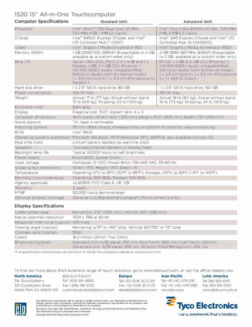 • Small integrated, all-in-one touchcomputer • Silent, fanless Intel® Celeron® M design • "Designed for touch" with a stable, wall/arm VESA mount, and mounting holes on stand bottom for table-top installations or wall mounting • Variety of optional field installable and replaceable point-of-service peripherals • USB 2.0, serial and cash drawer connectivity • Dual video display capability • On-screen display controls located on the side rather than the front, plus lockout function • Securable cable cover and Security lock receptacle