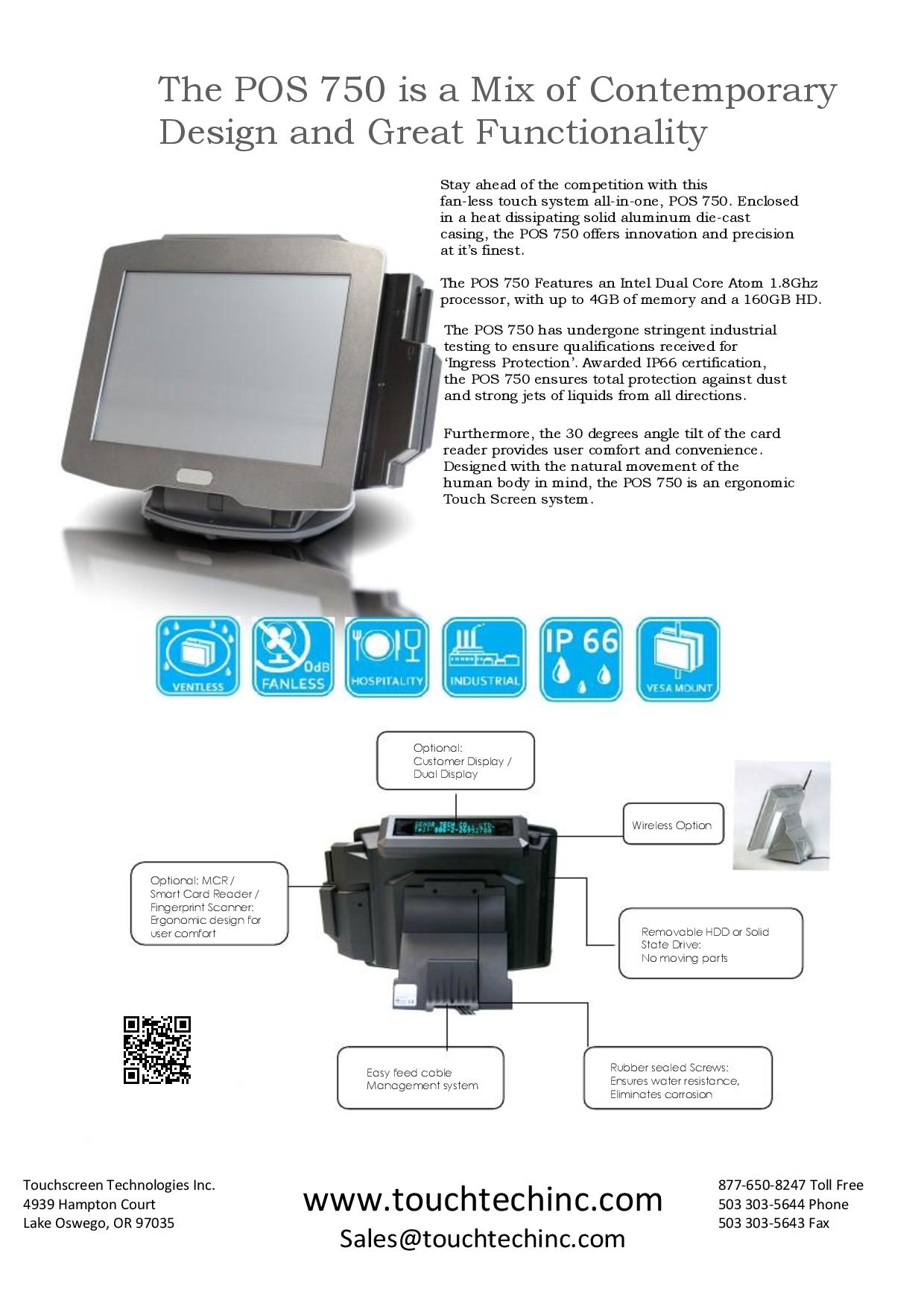 POS 750The POS 750 Features an Intel Dual Core Atom 1.8Ghz Processor, with 4GB Ram and a 160GB Hard Drive. The POS 750 is specially developed to satisfy the needs of reliable systems in harsh environments, ergonomically designed to work efficiently in the Control Processing, Medical, Retail and Hospitality industries. It is designed for convenience and comfort, and its aluminum casing and fanless features help you to clean it easily. Watch the video below to see it in action. The terminal has an IP66 rating– The first digit (6) indicates the terminal is dust tight giving complete protection against any solid matter entering the equipment. The second digit (6) indicates the terminal is protected against powerful jets of water meaning that a powerful jet can be aimed at the terminal from any direction with no harmful effect. |