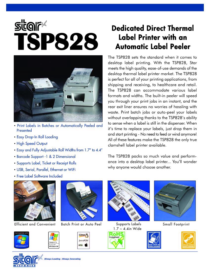 TSP 828The TSP828 sets the standard when it comes to desktop label printing. With the TSP828, Star meets the high quality, ease-of-use demands of the desktop thermal label printer market. The TSP828 is perfect for all of your printing applications, from shipping and receiving, to healthcare and retail. The TSP828 can accommodate various labels formats and widths. |